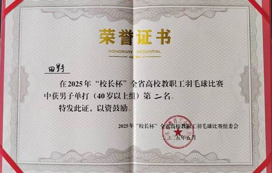 5月10日,2025年“校长杯”全省高校教职工羽毛球比赛落下帷幕,我校教职工代表队顽强拼搏,奋勇争先,最终,公共教学部田野荣获男子40岁以上单打第二名,取得我校参加该项赛事历史最好成绩,我校荣获“优秀组织奖”。