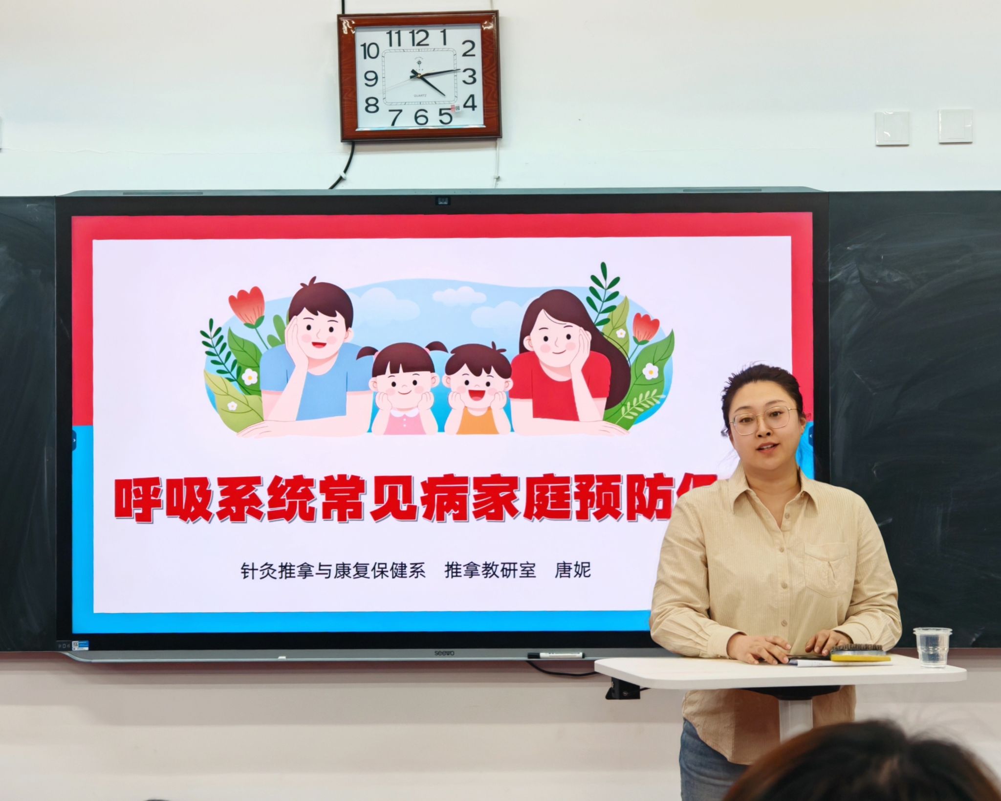 首场"小儿呼吸系统疾病家庭预防保健"专题培训特邀针灸推拿与康复保健系唐妮副教授担任主讲。唐老师从事小儿推拿临床与教学工作15年,擅长将推拿、艾灸、拔罐等传统中医疗法综合运用于小儿常见病症的防治。培训现场,唐老师重点围绕教职工普遍关心的儿童健康问题,系统讲解了小儿发热、咳嗽以及腺样体肥大等呼吸系统常见病的家庭预防与保健方法。通过理论讲解与实操演示相结合的方式,详细传授了"清天河水"退热、"工字搓背"止咳平喘以及"黄蜂入洞法"通窍等特色推拿手法。在唐老师的指导下,参训教职工互相配合,开展了手法实操练习。课后,参加培训的老师们一致认为这样的培训既实用又专业,让老师们在家里也能用绿色中医方法调理孩子身体。
